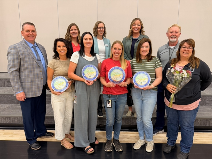 Pictured front L-R: Supt. Ben Dalton, Robin Coleman, Amanda Johnson, Heather Heath, Heather Tarver, Paraprofessional Rozann Cluff. Back L-R: Courney Bills, Christine Elegante, Vice Principal Sidney Hatch, Principal Dan Trimble.